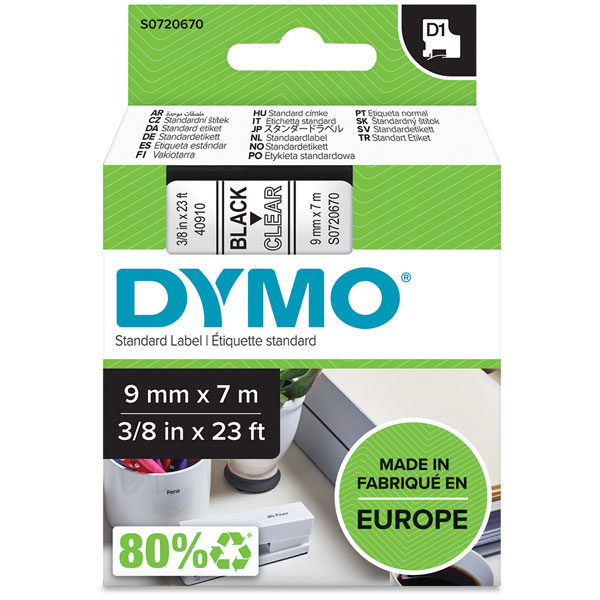 DYMO 40910 D1 LABELLING TAPE 9MM X 7M BLACK ON CLEAR