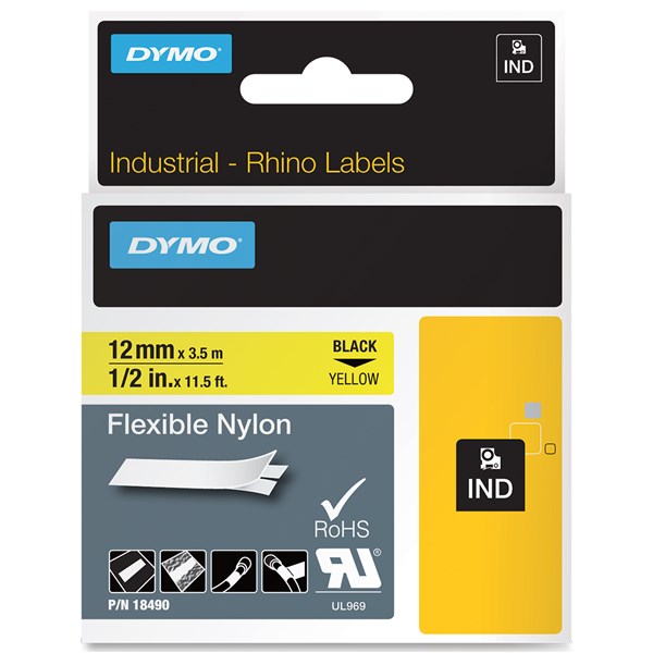 DYMO SD18490 RHINO INDUSTRIAL TAPE FLEXIBLE NYLON 12MM BLACK ON YELLOW