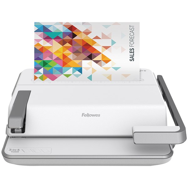 This Fellowes Lyra 3-in-1 Binding Machine allows users to comb bind, staple, and hole punch documents all in one machine