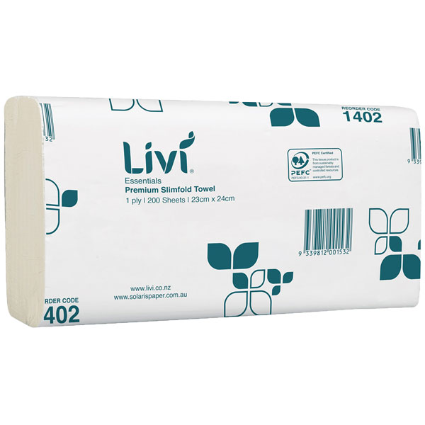 LIVI ESSENTIALS 1402 SLIMFOLD HAND TOWEL 1 PLY 200 SHEET 230 X 225MM CARTON 20