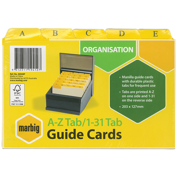 MARBIG GUIDE CARDS A-Z/ 1-31 TAB 127 X 76MM BUFF MANILLA PACK 30