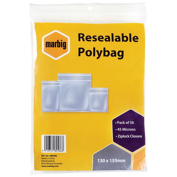 MARBIG PLASTIC BAG RESEALABLE 45MU W155 X L230MM CLEAR PACK 50