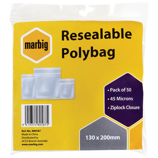MARBIG PLASTIC BAG RESEALABLE 45MU W130 X L200MM CLEAR PACK 50