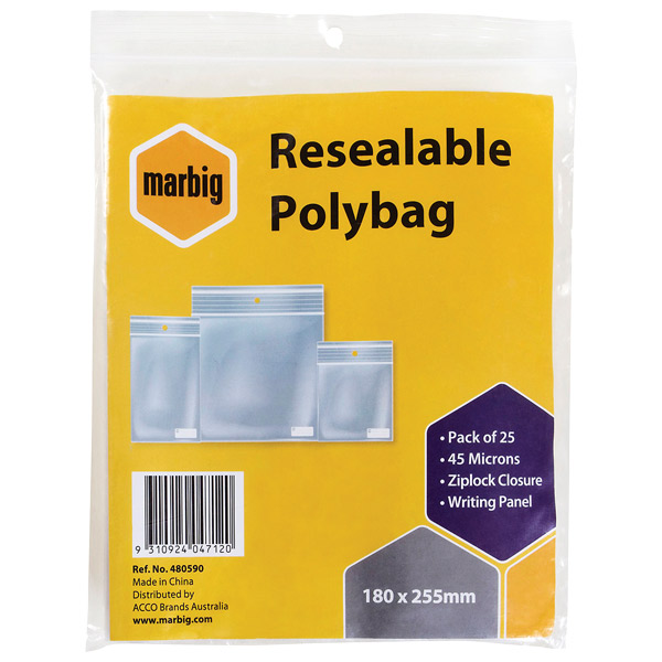 MARBIG PLASTIC BAG RESEALABLE 45MU W180 X L255MM CLEAR WITH WRITING PANEL PACK 25