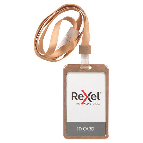 REXEL ID CARD HOLDER ALUMINIUM PORTRAIT WITH LANYARD ROSE GOLD