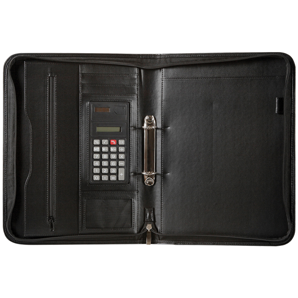 Features include a calculator, note pad and zip closure