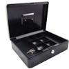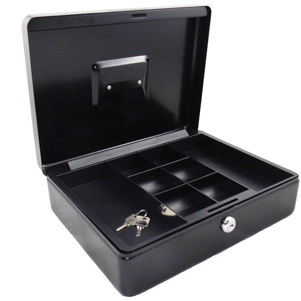 Strong metal 12 inch cash box for secure storage of cash, valuables, and important documents.