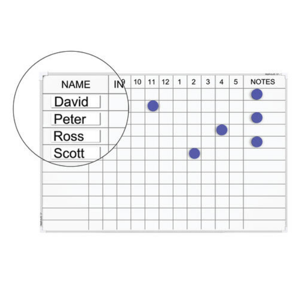 The Boyd Visuals staff indicator magnetic whiteboard is ideal for monitoring staff whereabouts as well as keeping everyone informed of staff whereabouts. It measures 450x600mm