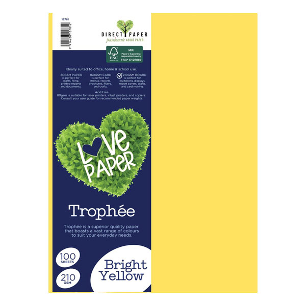 TROPHEE COLOURED PAPER A4 210GSM BRIGHT YELLOW PACK 100