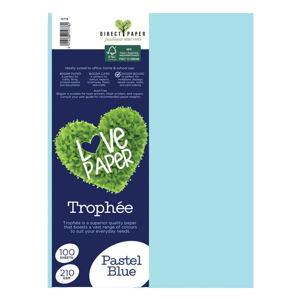 TROPHEE COLOURED PAPER A4 210GSM PASTEL BLUE PACK 100