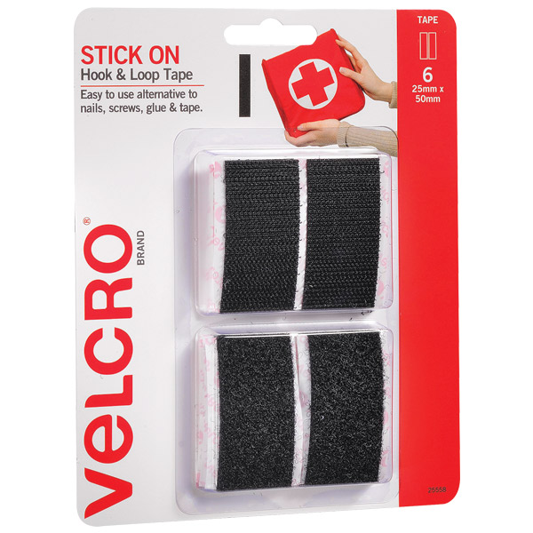 VELCRO STICK ON RECTANGLES HOOK AND LOOP 25 X 50MM BLACK PACK 6