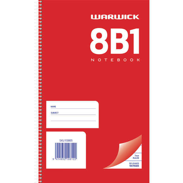 WARWICK 8B1 EXERCISE BOOK 7MM RULED SPIRAL BOUND W100 X L165MM 50 LEAF