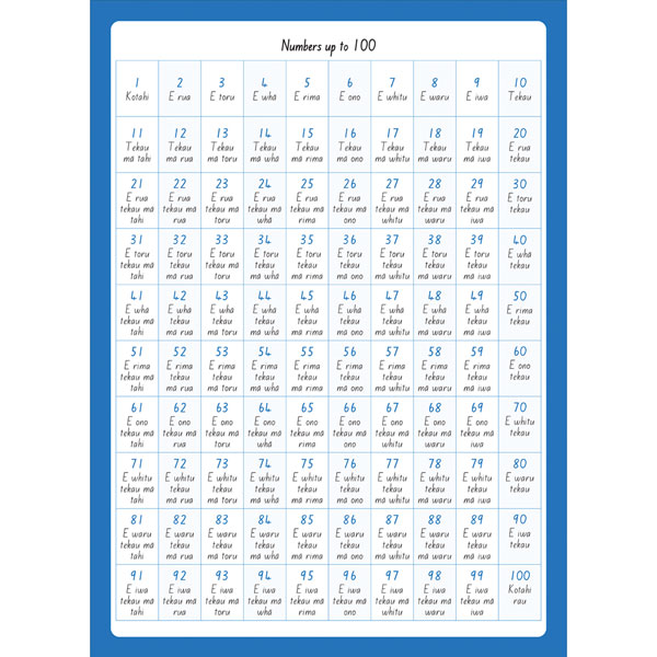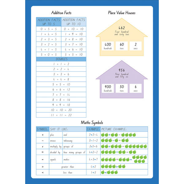 Reference material includes numbers up to 100 (translated in Te Reo Maori), addition facts, place value houses, maths symbols and space on the back cover to practice writing numbers